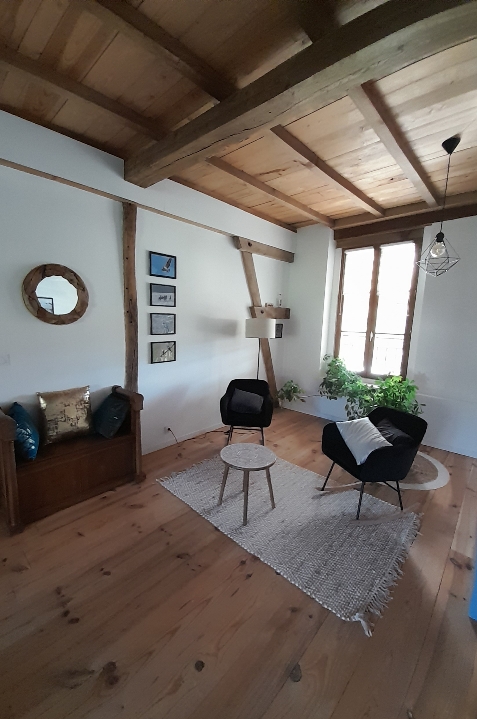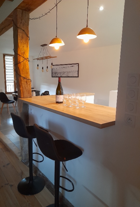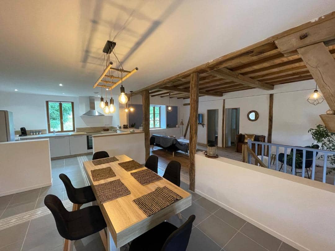 A l'étage, son magnifique espace de vie lumineux avec ses poutres apparentes crée une vraie ambiance chaleureuse de partage avec sa salle à manger, son petit salon coin lecture et sa cuisine intégrée avec son bar ouvert…