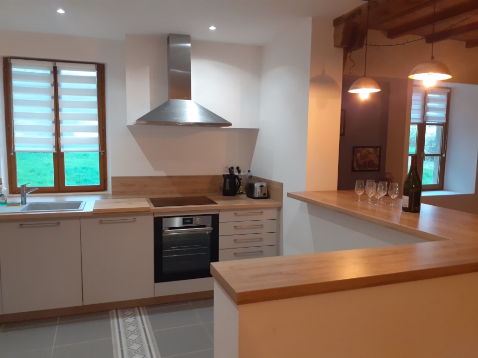 - Coin cuisine équipée : plaque induction, four, réfrigérateur, lave vaisselle, vaisselle, appareil raclette, micro-onde, cafetière, bouilloire, grille pain, ustensiles de cuisine…